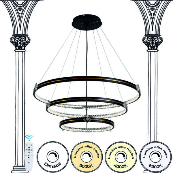 Lustra Led Aluminiu 158W 5100Lm Trei Moduri Iluminare d400mm/600mm/800mm Negru/Auriu