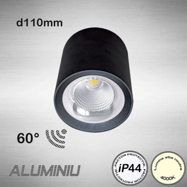 Spot Led Aparent Aluminiu 20W 4000K d110mm iP44 Negru 230V 60°